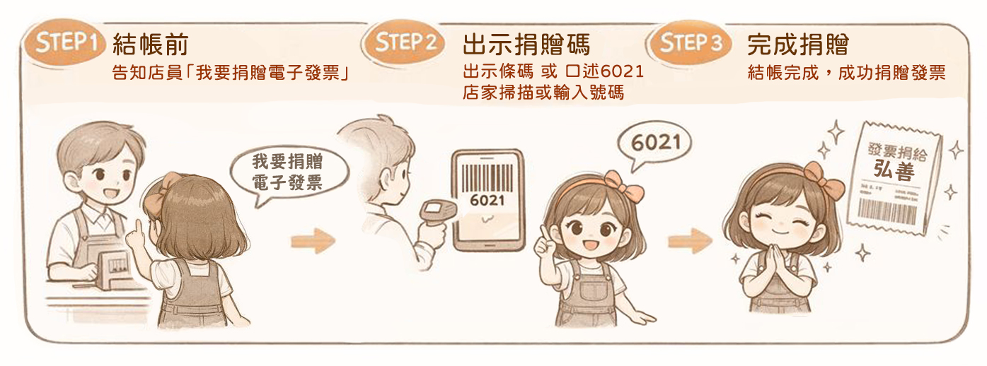 發票隨時捐,愛心不用等 消費前|事先綁定,自動捐贈 到「財政部電子發票整合服務平台 www.einvoice.nat.gov.tw」 設定已持有之載具 指定捐贈對象: 社團法人弘善文化推廣學會 使用該載具索取雲端發票時, 即可自動完成捐贈。 消費時|結帳告知,現場捐贈 消費後|雲端選取,手動捐贈 已存入載具的發票也能捐! 登入「統一發票兌獎」App 或到超商多媒體機台(KIOSK), 勾選已存的發票,即可進行捐贈。 ※已公布開獎之發票無法捐贈。